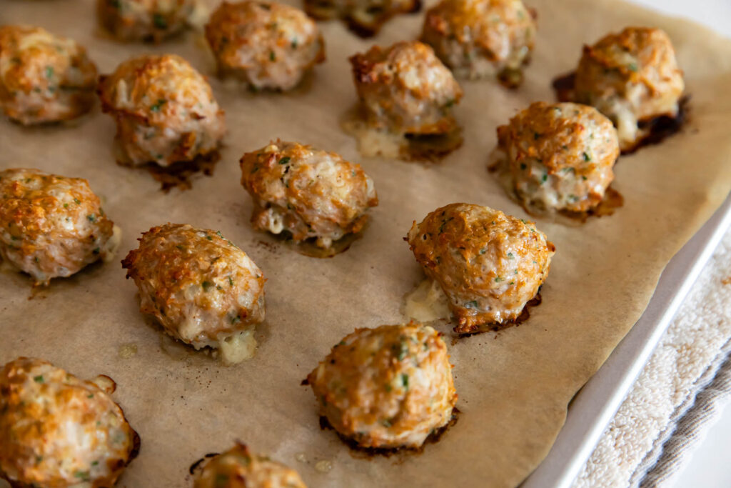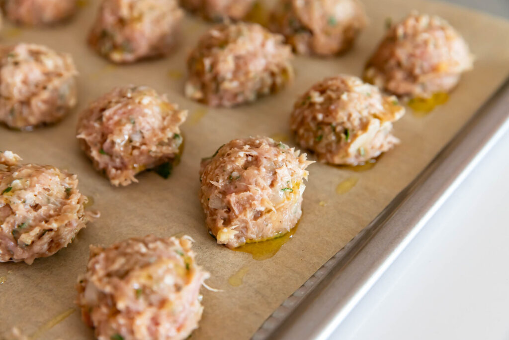 Line a baking sheet with parchment paper. Scoop 1 ½ TBSP of the meatball mixture onto the baking sheet, closely lining them up. Fill up the pan and drizzle quickly with olive oil across the tops.